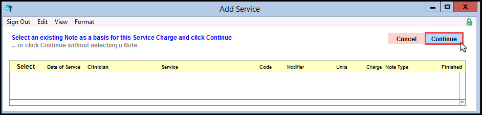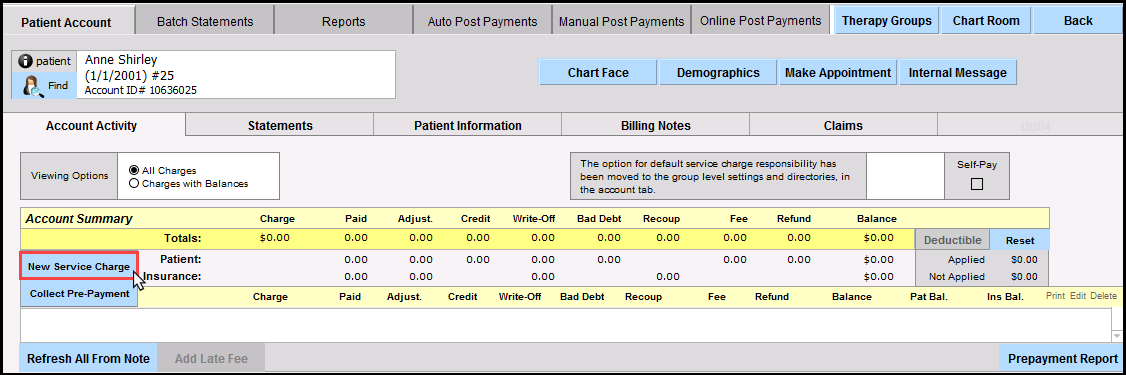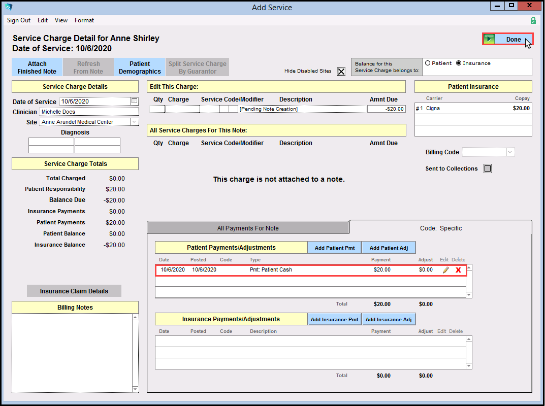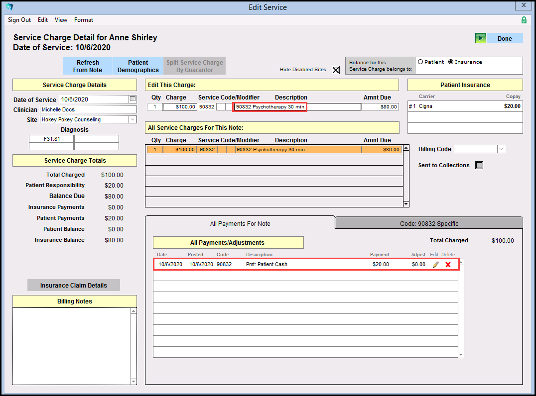 18. The Edit Service Window will show that the Service Code that was used in the note has been added where the Description used to say 'Pending Note Creation'. The payment has been credited to the total charge, no longer showing a negative balance.