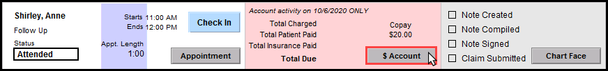 4. Click the '$ Account' button in the entry for the patient you want to document the copay on.