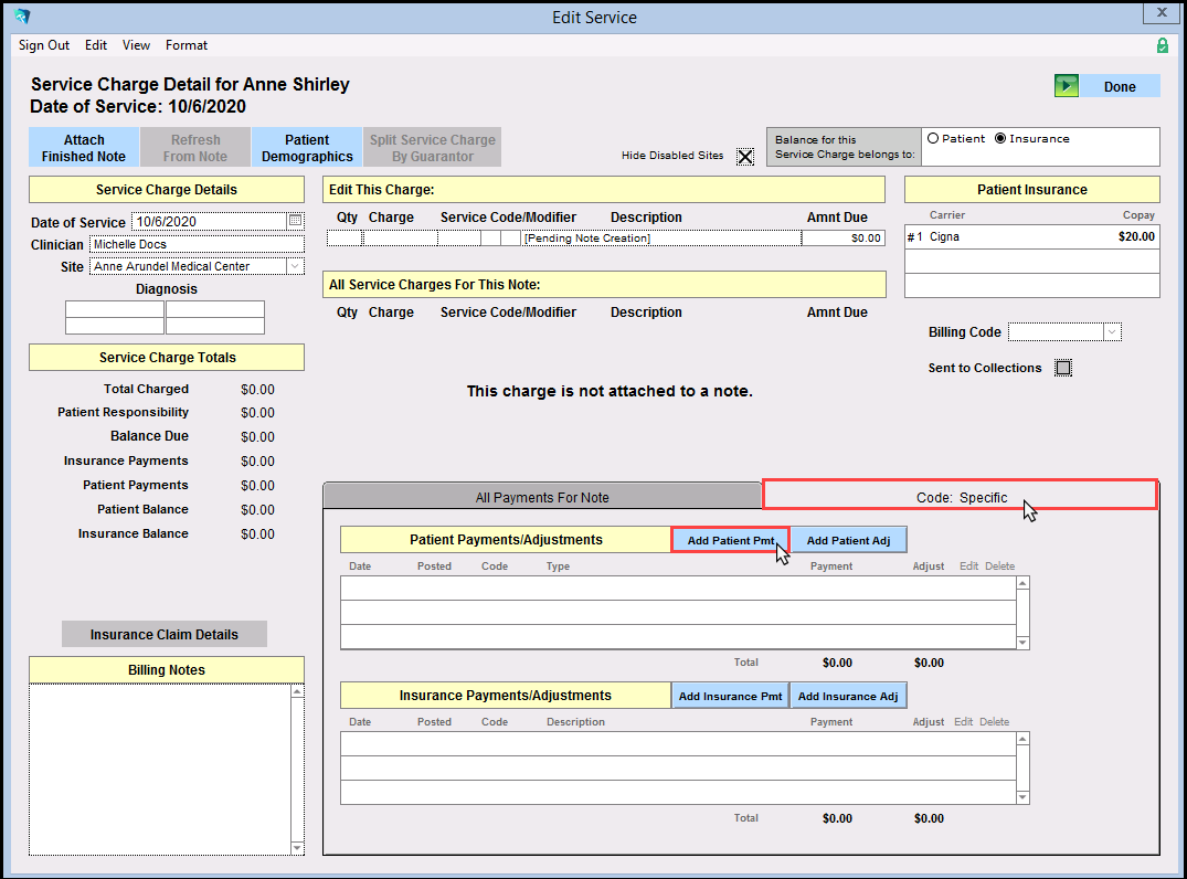 8. In the Add Service Window, click on the Code Specific tab then click on 'Add Patient Pmt'.