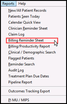 1. Go to Billing Reminder Sheet via the Reports drop-down menu.