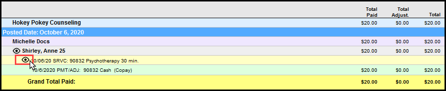 17. The report will generate a list of patients who've you posted payments for that day. Click on the eye icon next to the service on the light yellow line.