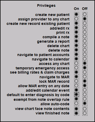 - exempt from note overlap rule: This setting only matters if the group level rule "Prevent Overlap" is enabled; if so, turning on this user-level privilege will allow the user to compile notes even when the Start and End Times overlap with that of other notes for the patient that day or notes made by the user that day.