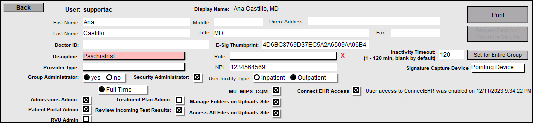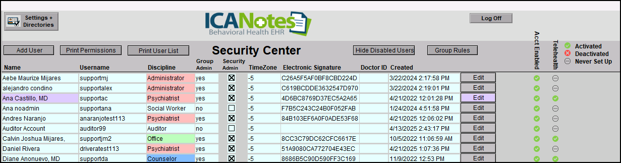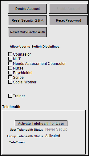 - Activate Telehealth for User: Security Administrators can enable Telehealth for a user. Note: your group must have the Telehealth feature enabled.