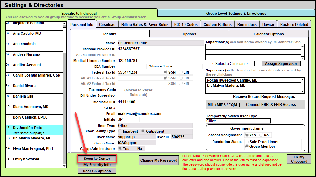 The ICANotes Security Center is available to users designated as Security Administrators for their group.