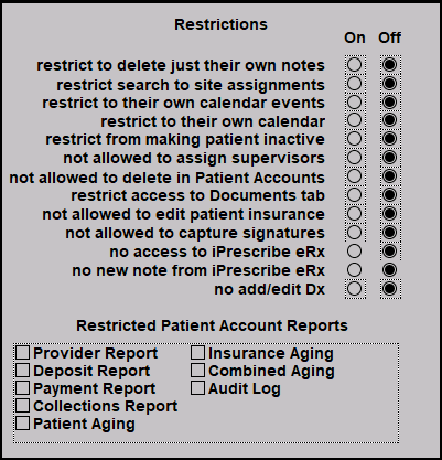 - no access to iPrescribe eRx: Prevents user from accessing iPrescribe eRx. Note: this is applicable only if your group integrates with DrFirst for e-Prescribing and has the iPrescribe feature enabled.