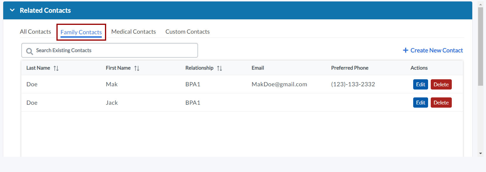 When you choose the All Contacts tab, you'll see a comprehensive list of all contact types (family, medical, custom), as illustrated in the screen above.