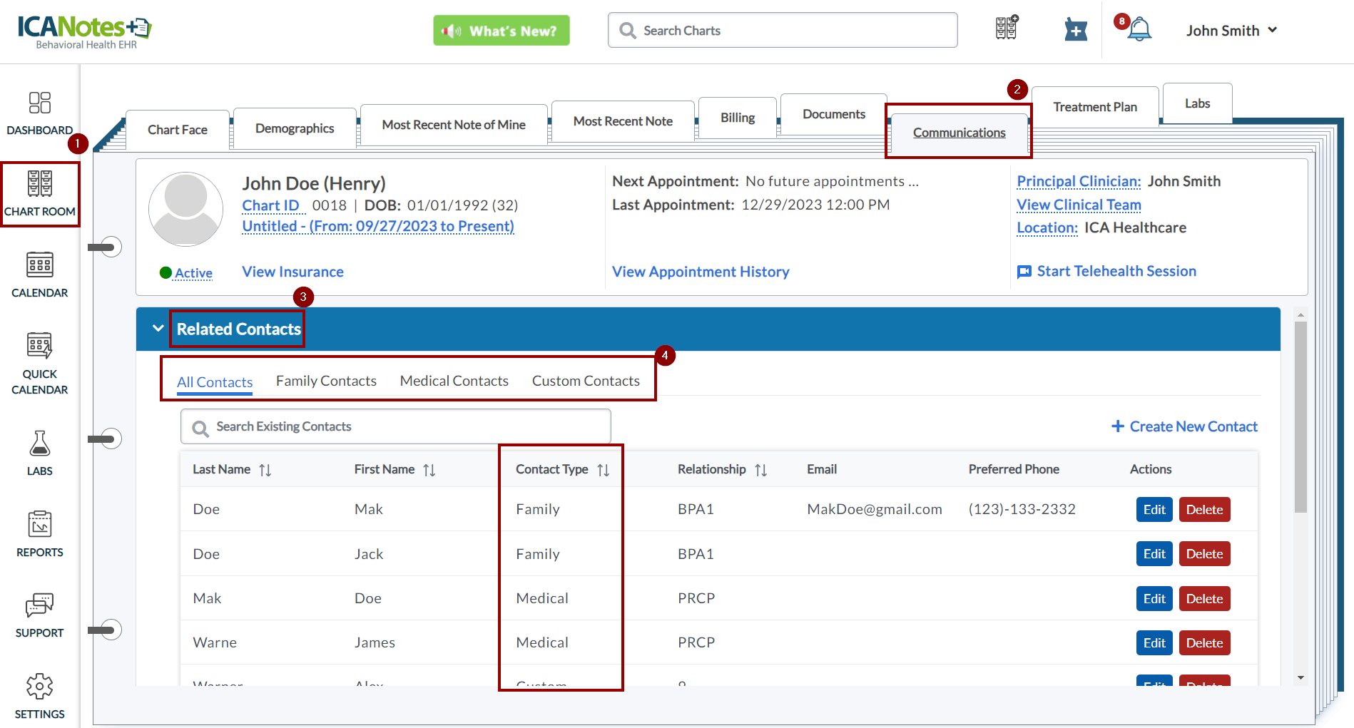 Similarly, you can select the Medical Contacts and Custom Contacts tabs to view the contacts within these tabs.