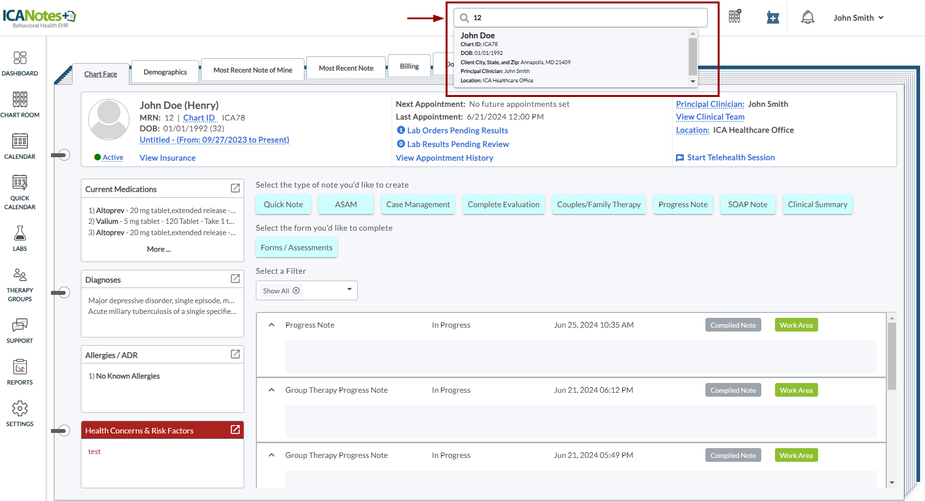 In the search bar on the top, you can enter the Medical Record Number (MRN). This will display the corresponding client details, as shown in the screenshot below. Click on the client details to navigate to the chart face.
