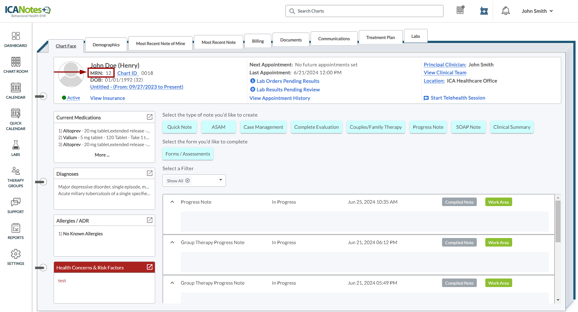 We are excited to announce the addition of the Medical Record Number (MRN) field in ICANotes+. This automatically generated field serves as a unique identifier for every chart, ensuring each client has a distinct identity. The MRN field is immutable, enhancing communication and coordination within the practice.