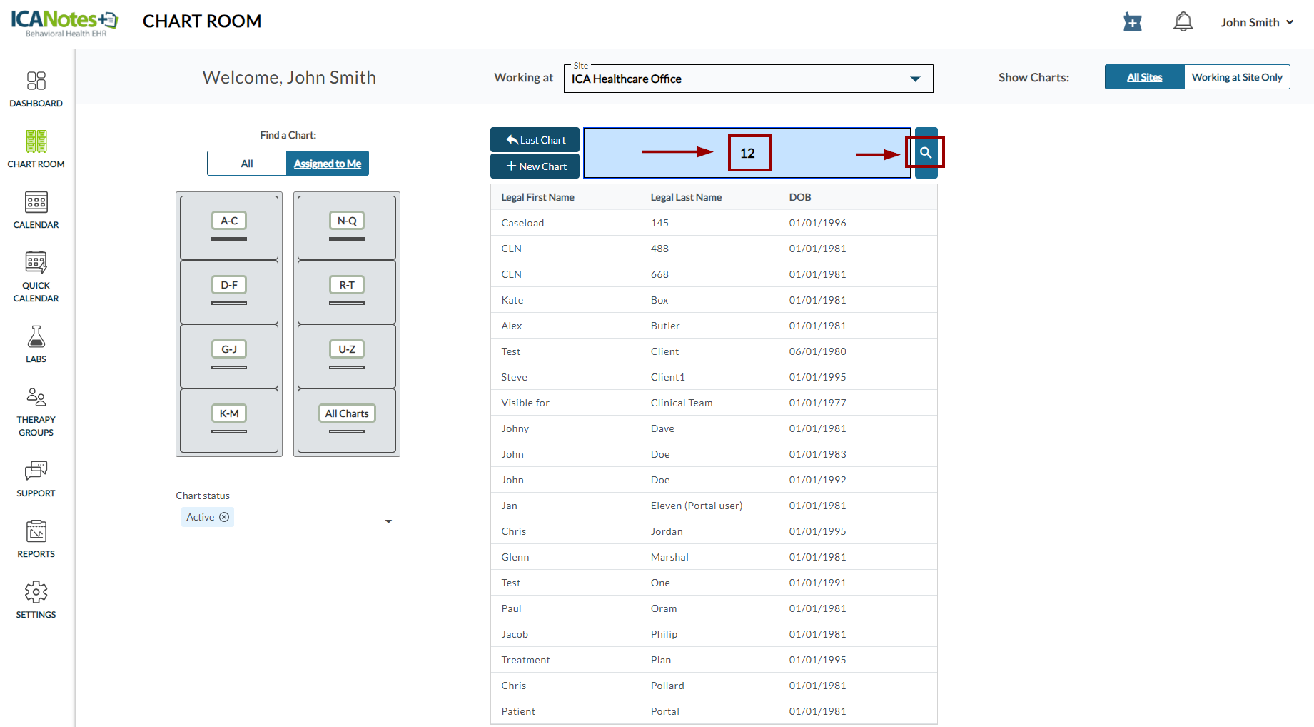 You can also search for clients using their MRN in the chart room. Enter the MRN and click the magnifier icon as shown below. This will redirect you to the corresponding client's chart.
