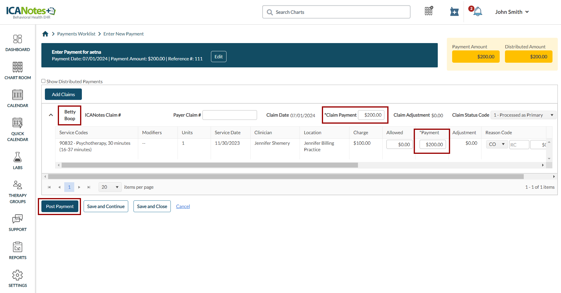 Follow these steps to post payment for the claim that has not been submitted in ICANotes+.