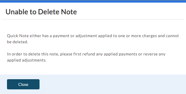 In instances where a note is associated with one or more charges that have payments or adjustments applied, the system will now restrict the deletion of such notes. A notification will be displayed when attempting to delete the note, indicating that payments or adjustments have been applied to one or more charges. To proceed with deletion, it is necessary to refund payments or reverse adjustments, applied if any.