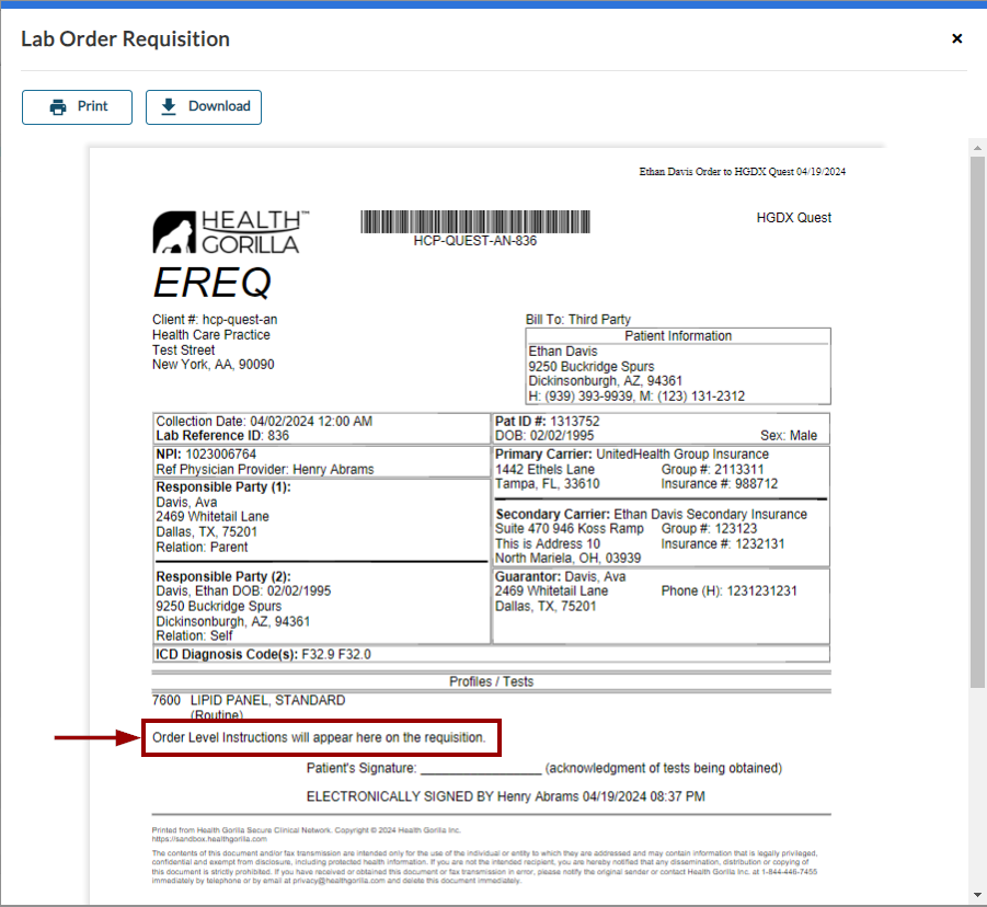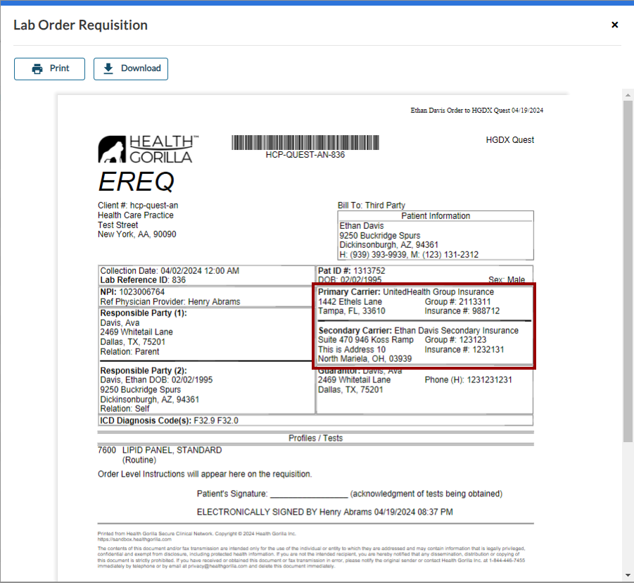 On the requisition, the primary and secondary payer details will appear as shown in the screen below.