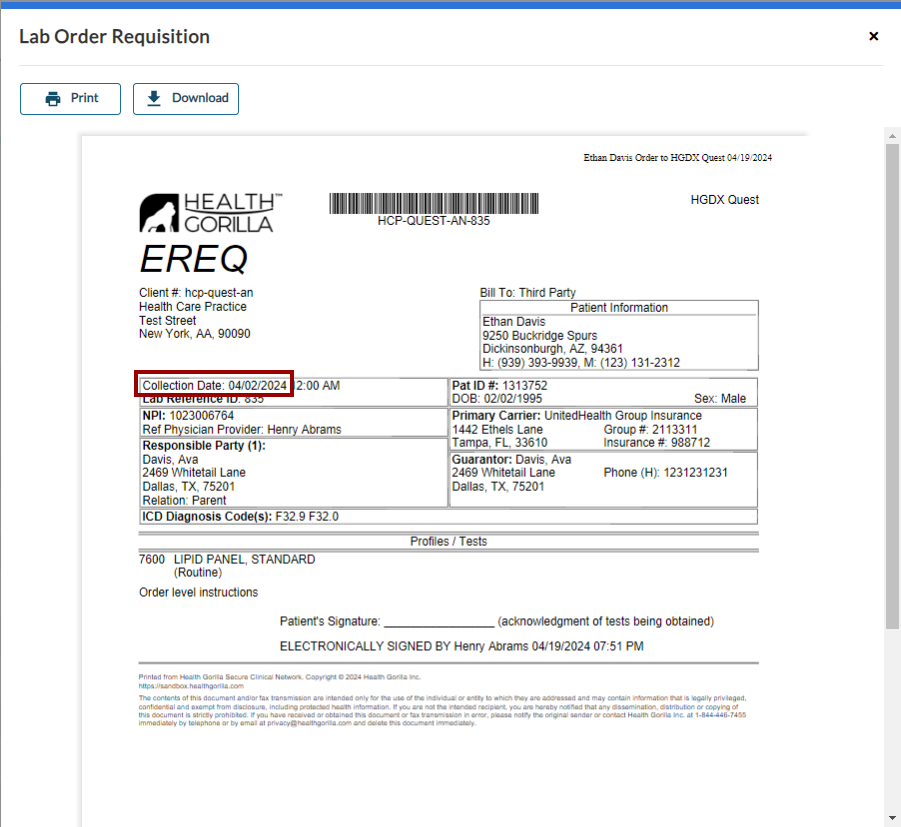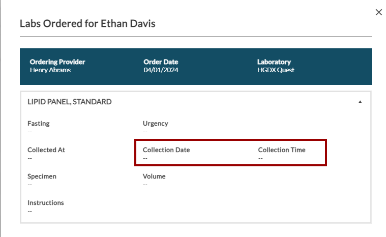 When you view the order details from the Lab Orders tab, you can find the Collection Date and Collection Time fields as highlighted in the screen below.