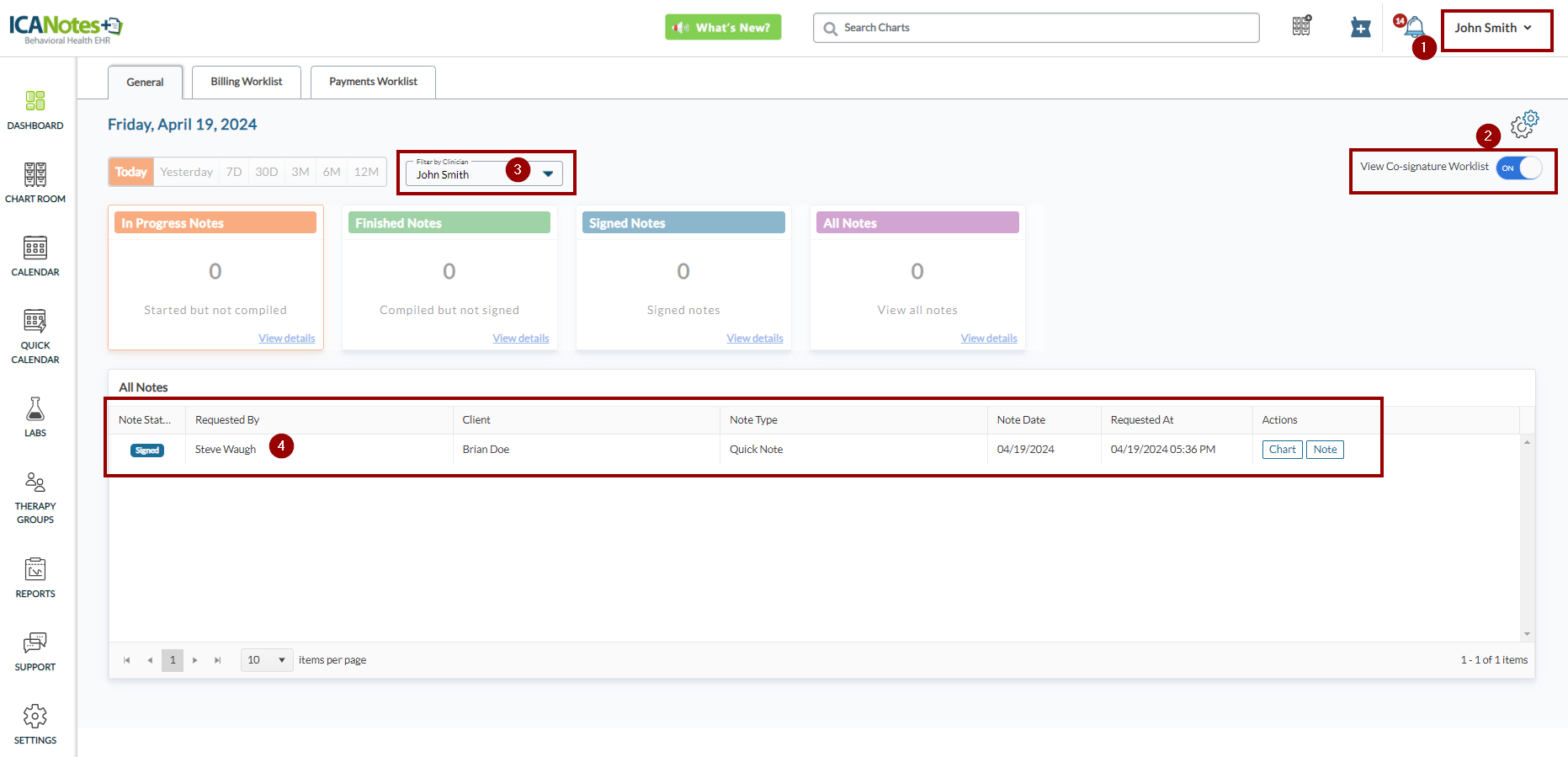When the administrator (John Smith) accesses the Dashboard to view co-signature requests, it will display as depicted below. However, if administrators wish to view co-signature requests sent to other clinicians, they can choose the clinician from the dropdown menu, as illustrated below, to access co-signature requests sent to them.