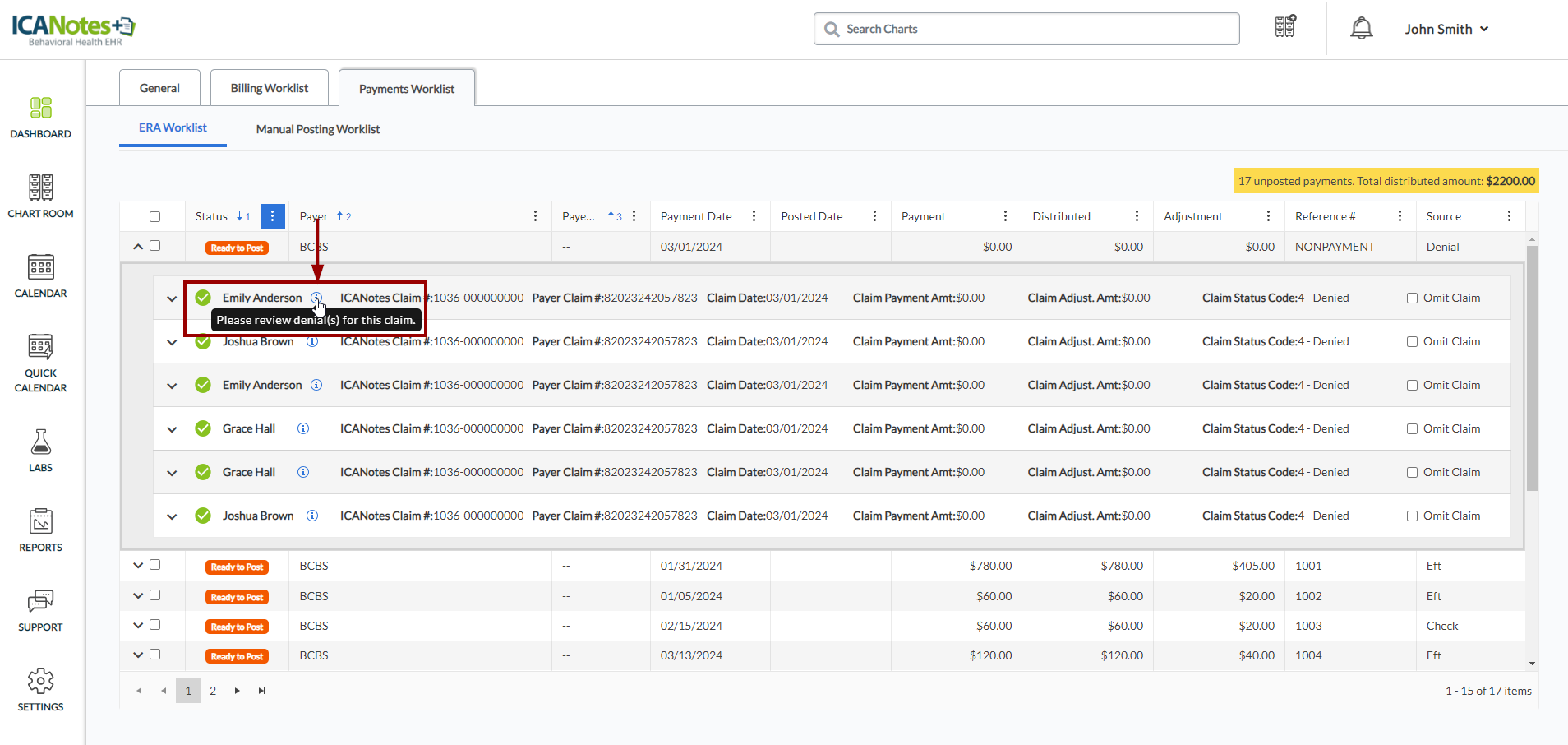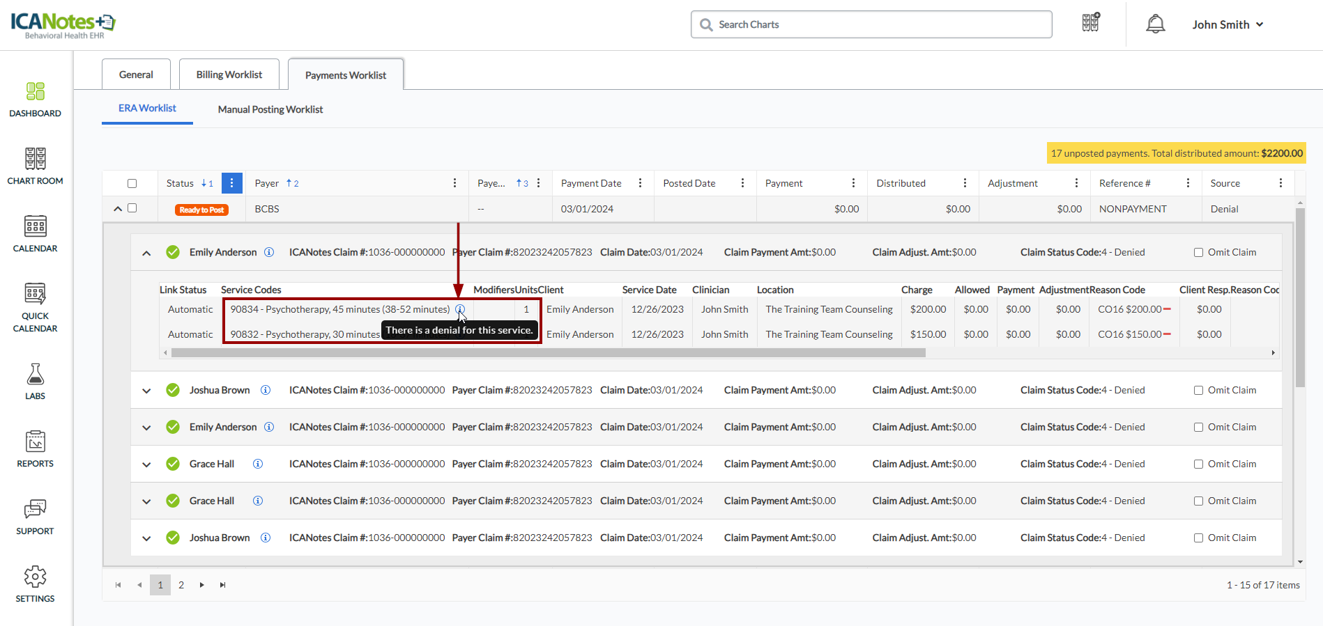 The ERA Worklist has been enhanced to alert billers about denials and negative balances on claims. In the ERA Worklist, expanding payer details reveals an info icon next to the client name. Hovering over this icon notifies you to review denials/negative balances on the claim. Similarly, expanding client details reveals the info icon next to services with denials/negative balances. Billers can then review and make necessary corrections before resubmitting claims.