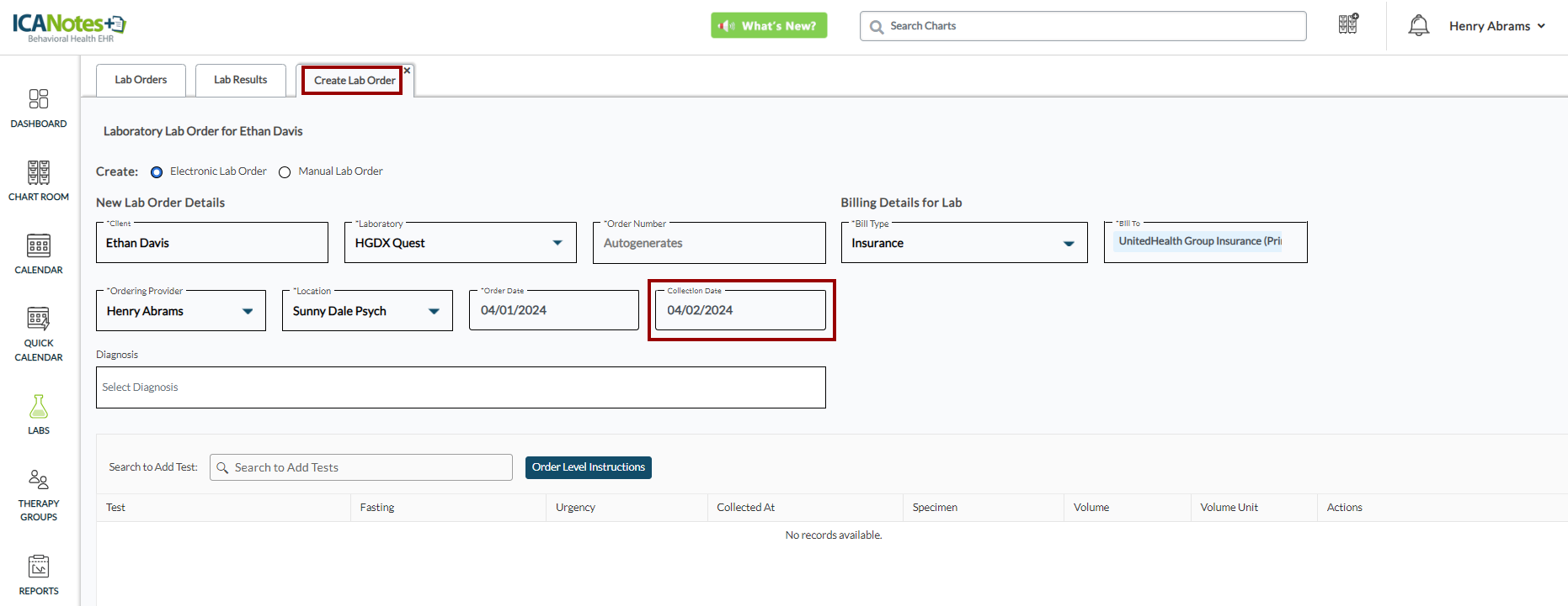 On the Create Lab Order tab, locate the new Collection Date field as shown below that allows you to select the date at order level.