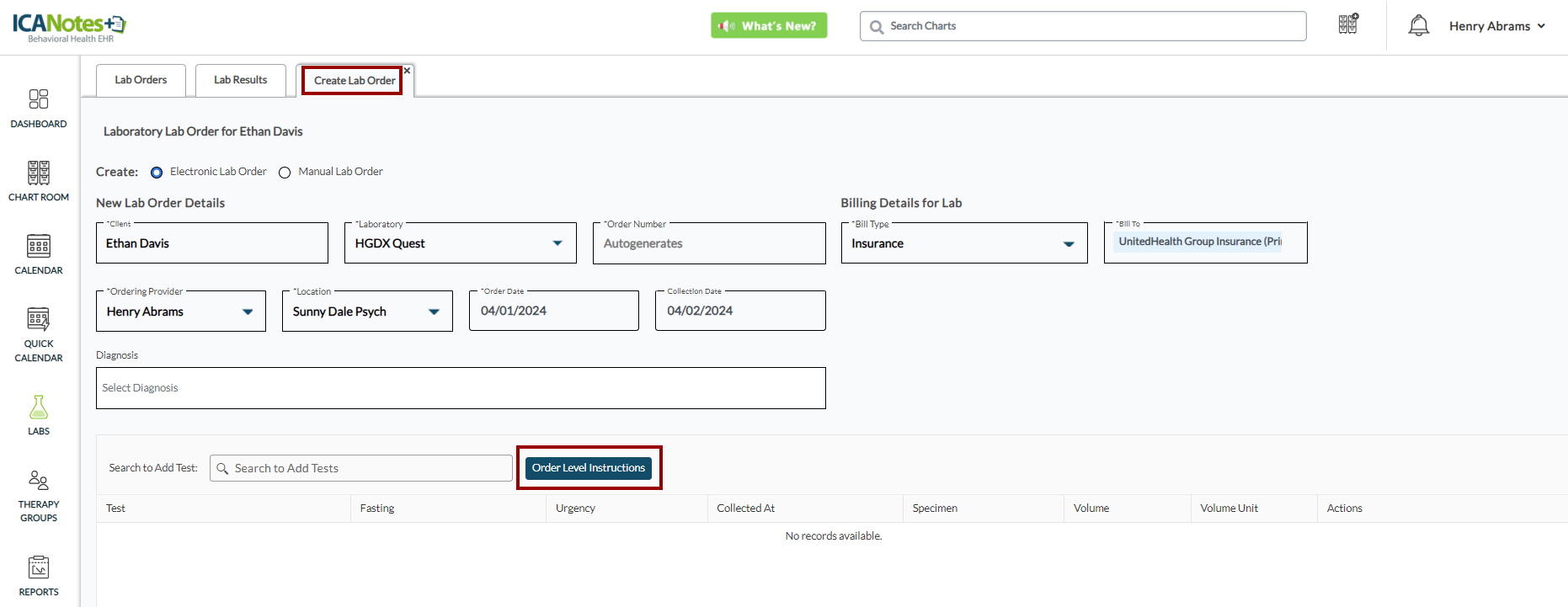 On the Create Lab Order tab, locate the new Order Level Instructions button as shown below.