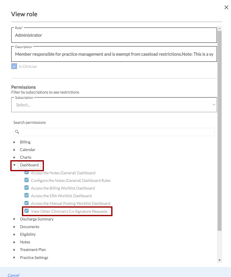 In the Dashboard section, check the box labeled "View Other Clinicians' Co-Signature Requests," as demonstrated below. Administrators will automatically possess this permission.