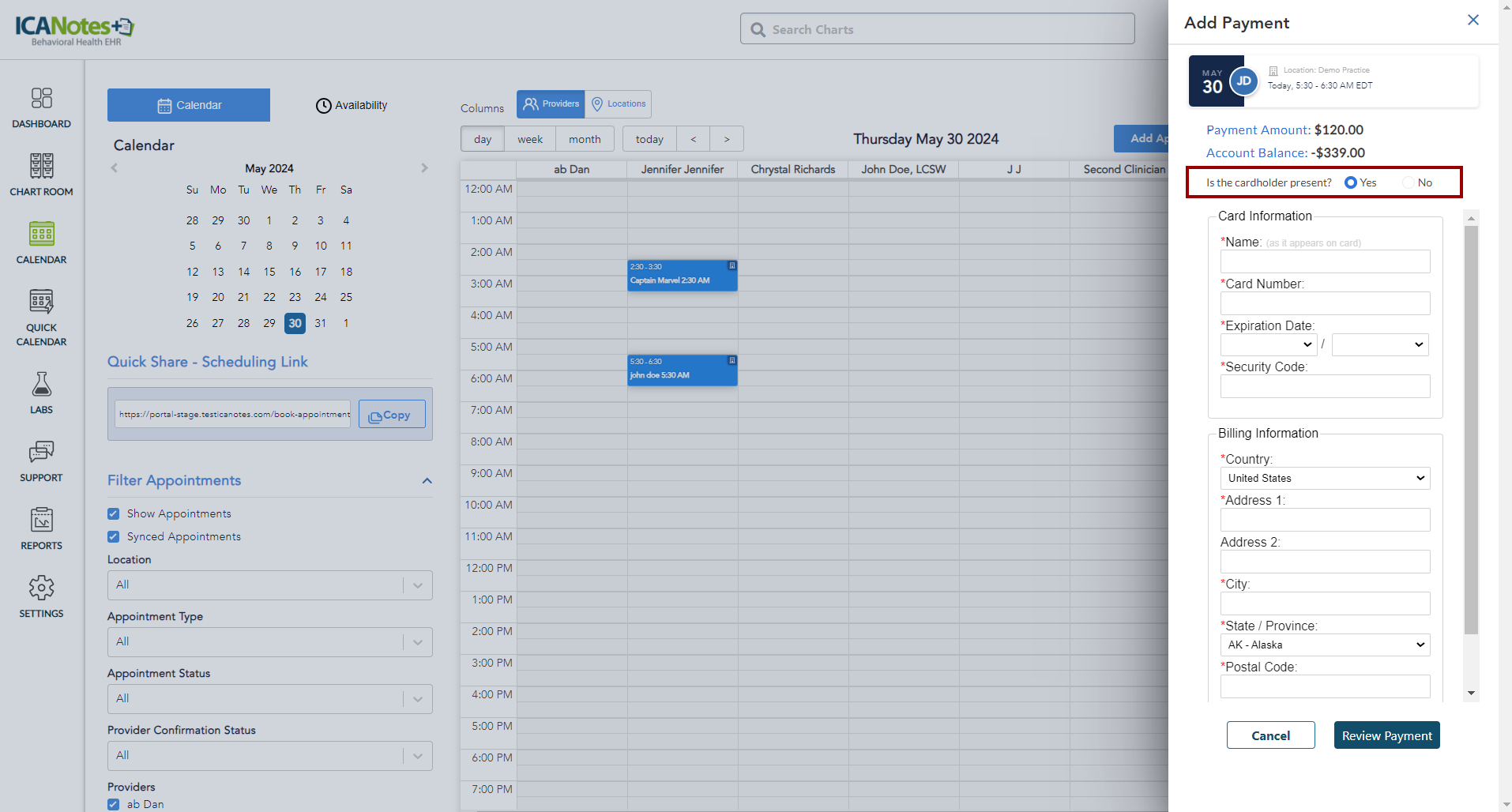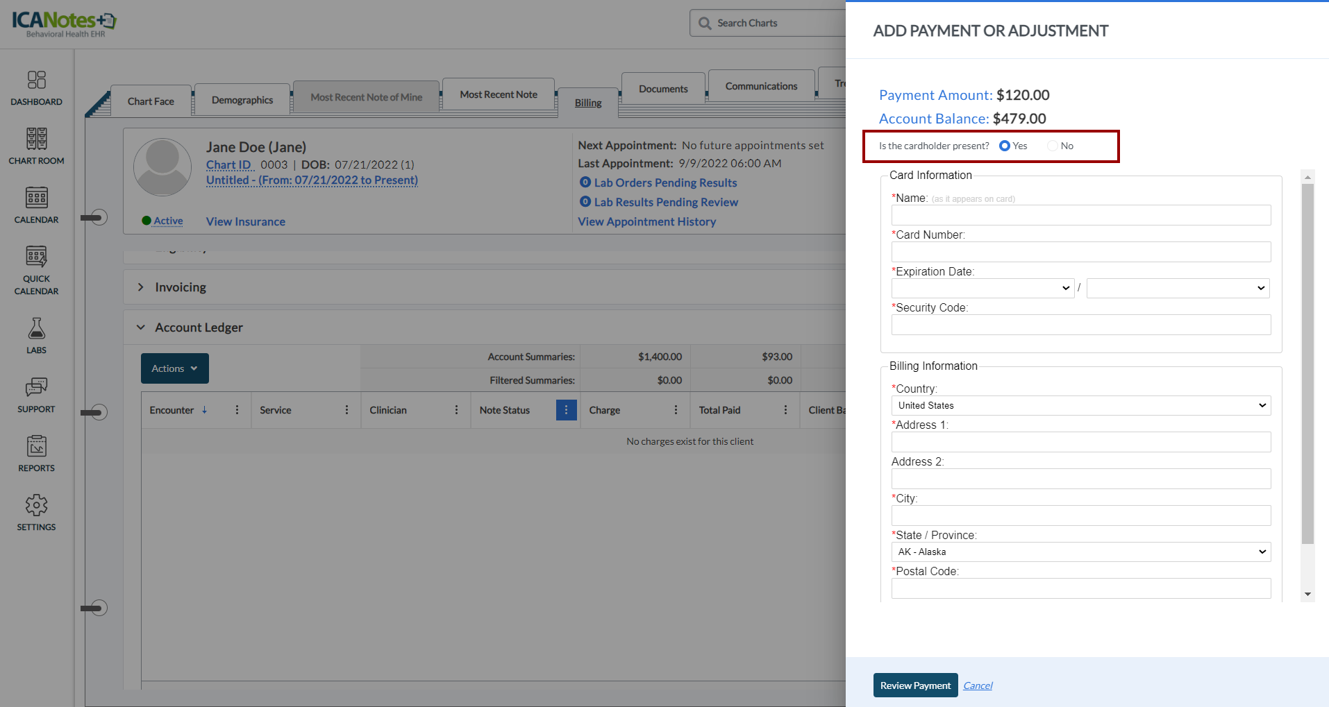 To meet Mastercard's compliance requirements, ICANotes+ will now prompt you with a question whenever you add a new credit card: "Is the cardholder present?" You must answer Yes or No before continuing. This question will also appear for saved cards that have not yet been used for transactions. This procedure helps us ensure secure credit card transactions.