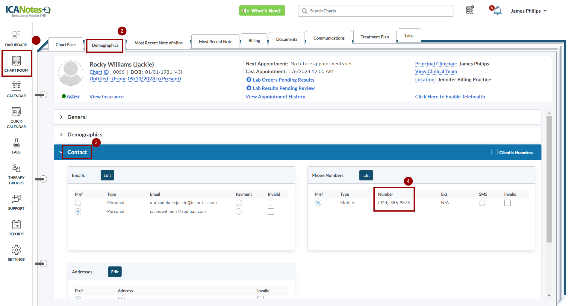 Client's preferred phone number can be accessed from the Demographics section > Contacts tab, as shown in the screen below.