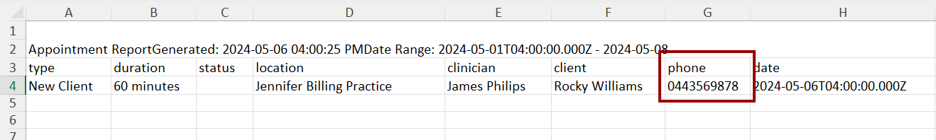 When you export the Appointments Report to Excel, the Phone Number appears as shown below: