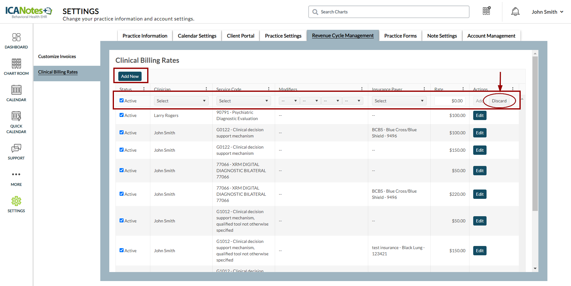 Once you have clicked the "Add New" button to create a new billing rate, if you decide not to proceed and wish to discard the entry, simply click the "Discard" button, as indicated in the screen below.