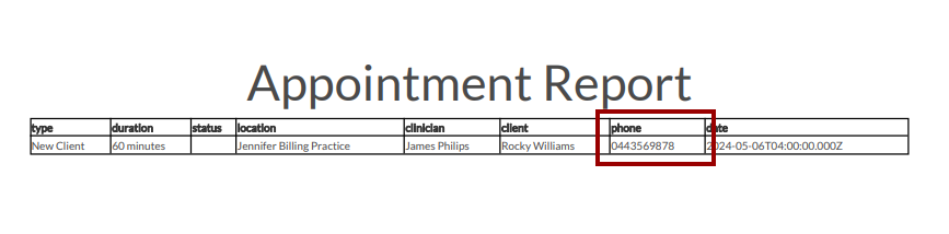 When you export the Appointments Report to PDF, the Phone Number appears as shown below: