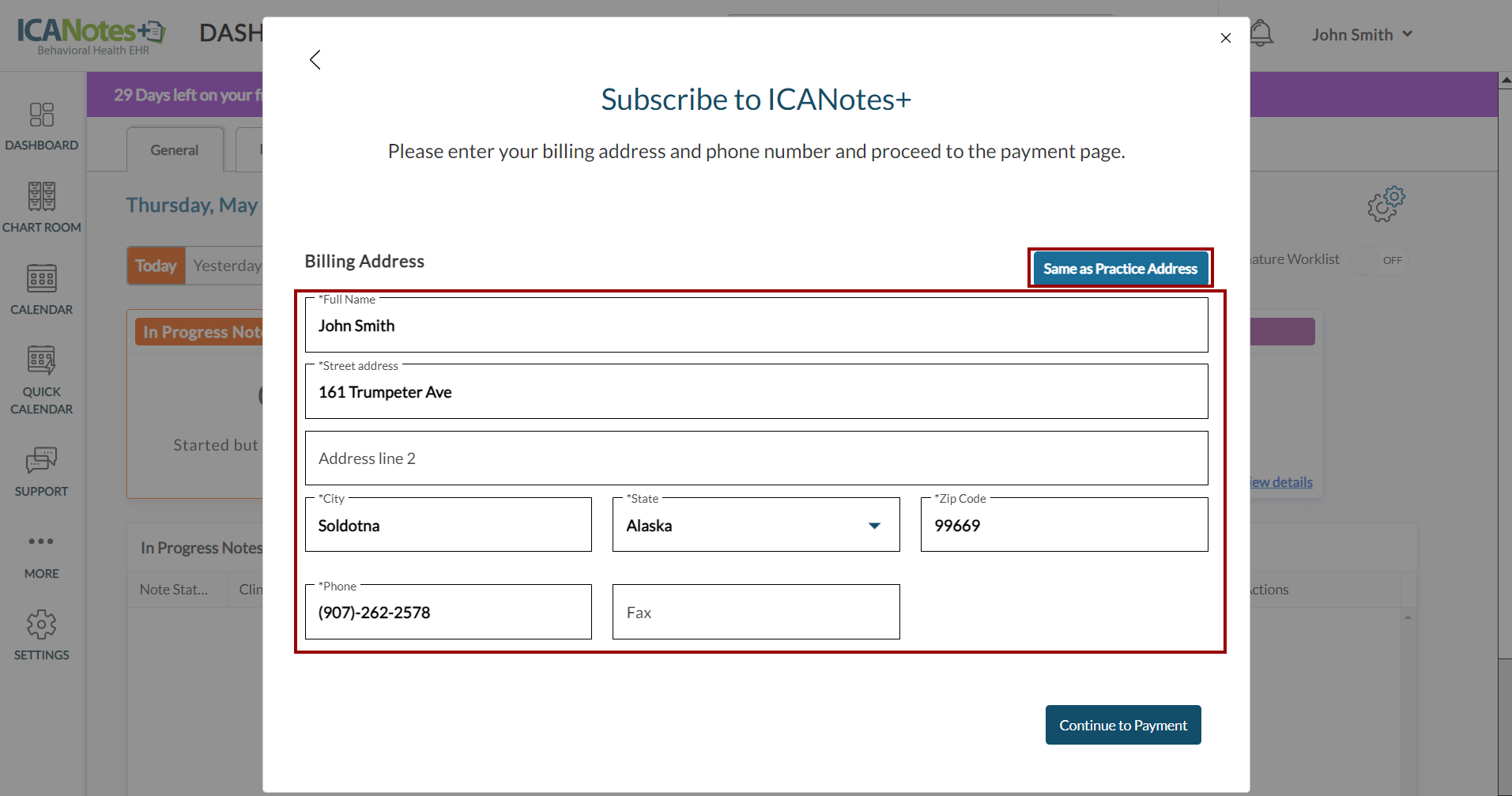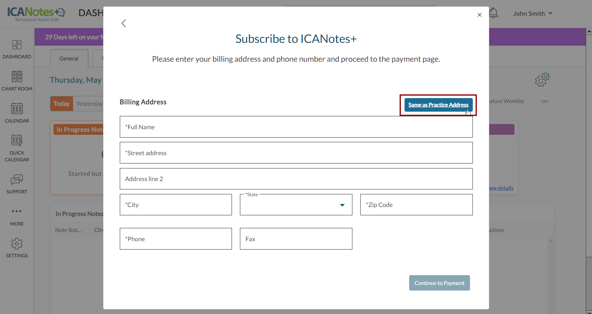 When subscribing to ICANotes+, you can now enter the billing address to match the practice address by clicking the provided button.
