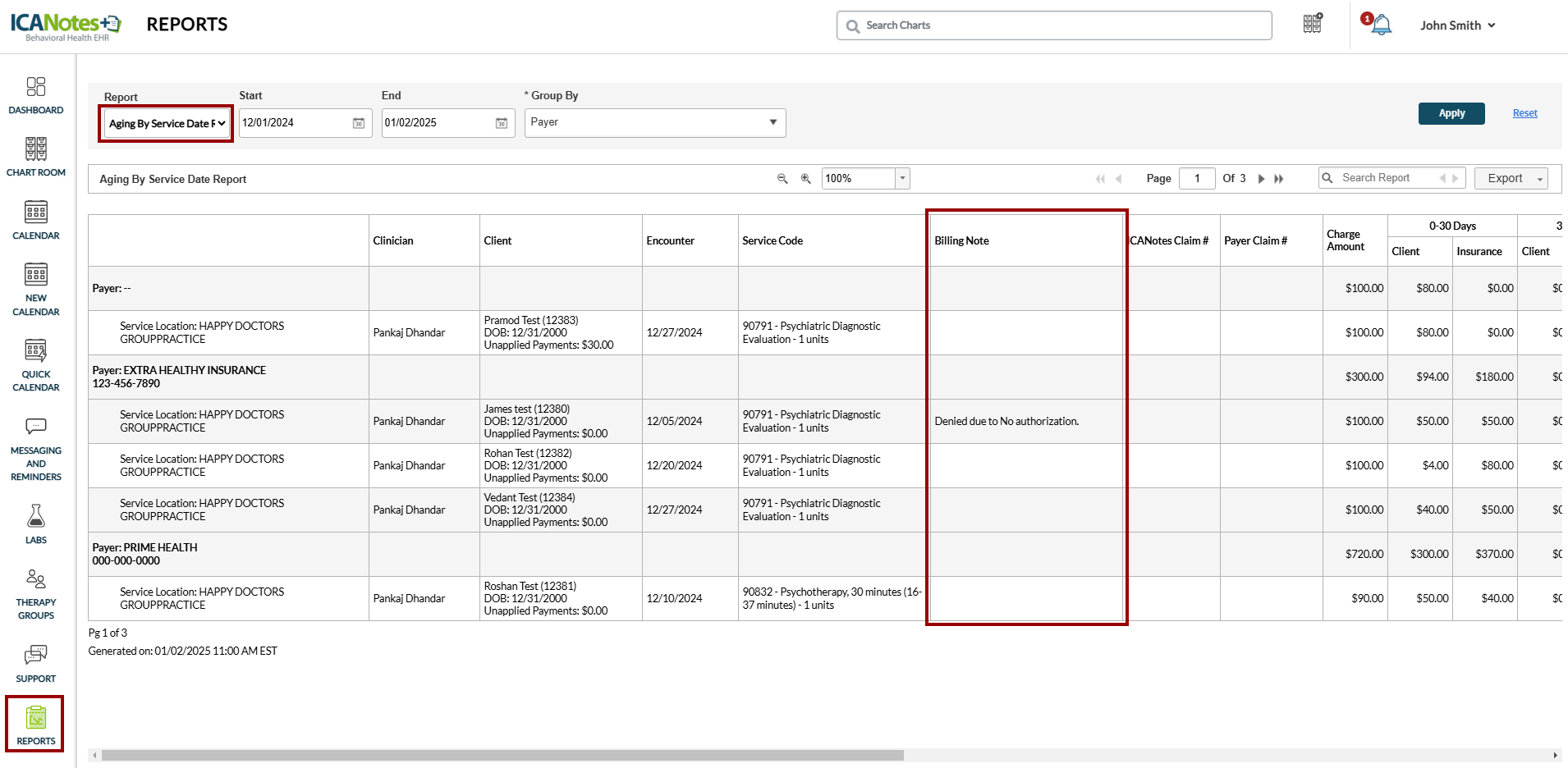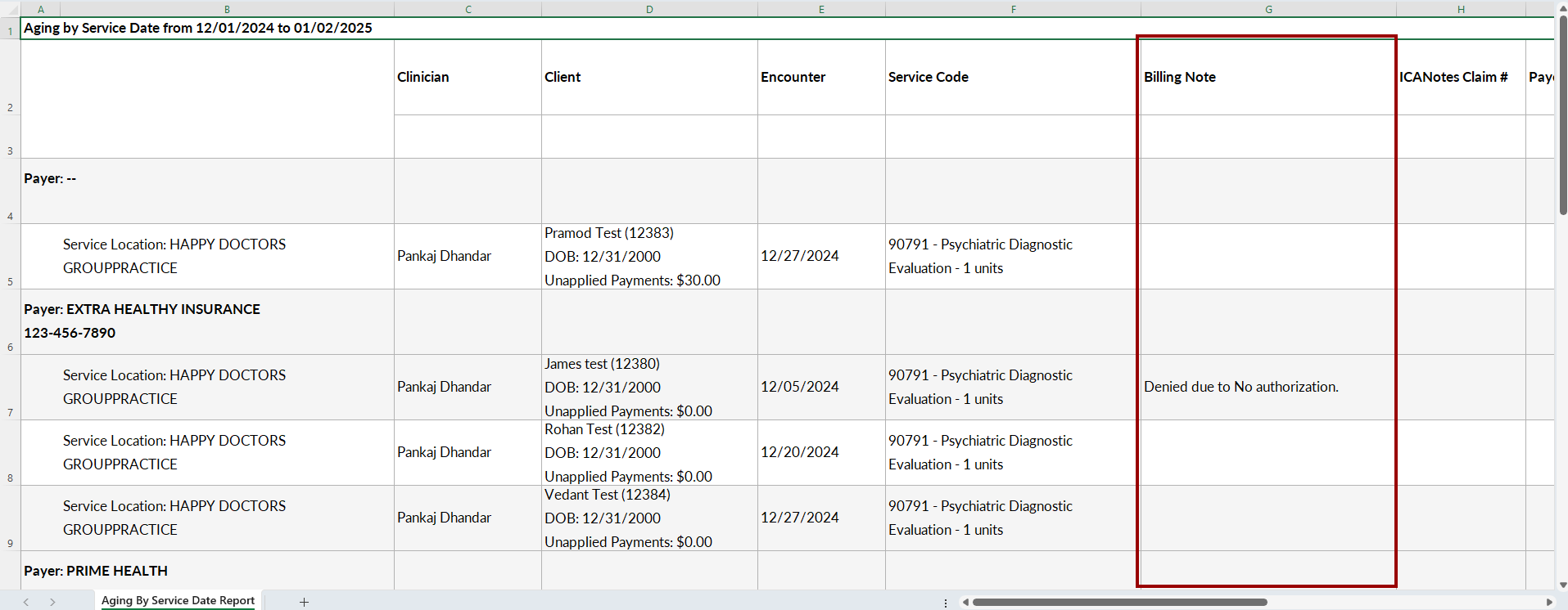 In the previous release, we introduced the Billing Note feature in the Billing Worklist, allowing billers to add notes directly from the Billing Worklist tab. With this update, billing notes will now be displayed on the Aging by Service Date report, as illustrated in the screenshot below: