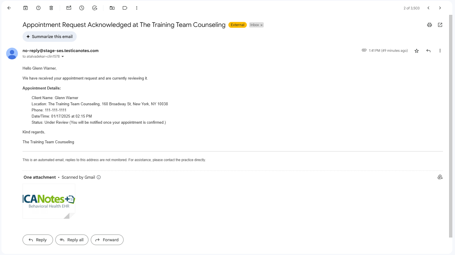 Below is an example of the email confirmation clients will receive when they request an appointment through the Quick Share Link with the 'Automatically Confirm Appointments' flag disabled.
