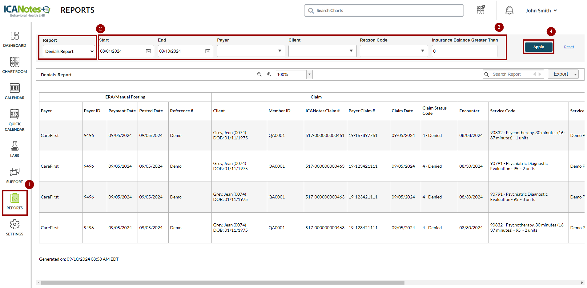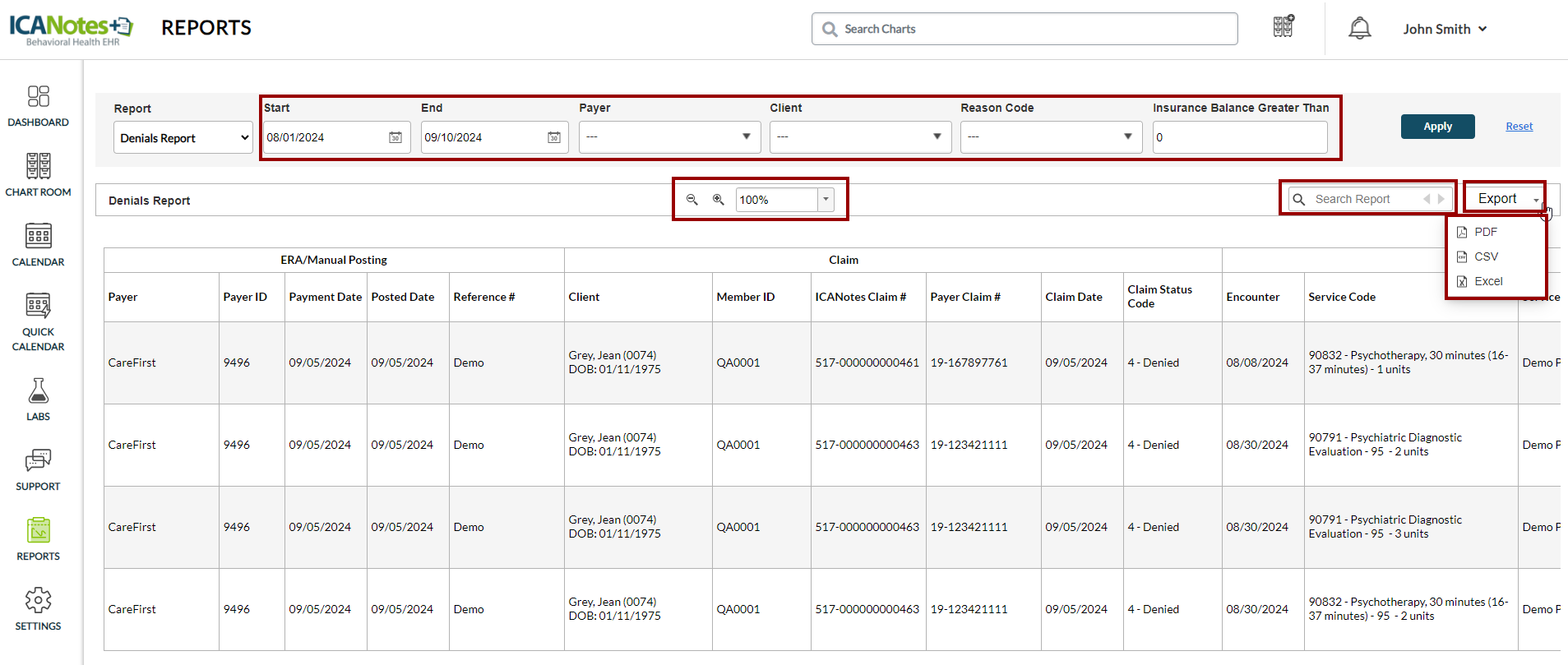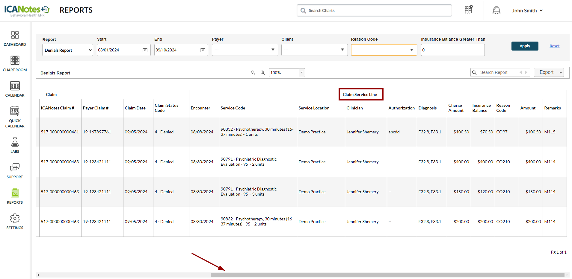The new Denials Report is designed for individuals responsible for processing denied claims. This report enables users to view all denied claims in detail, allowing for efficient follow-up, corrections, and rebilling processes.
