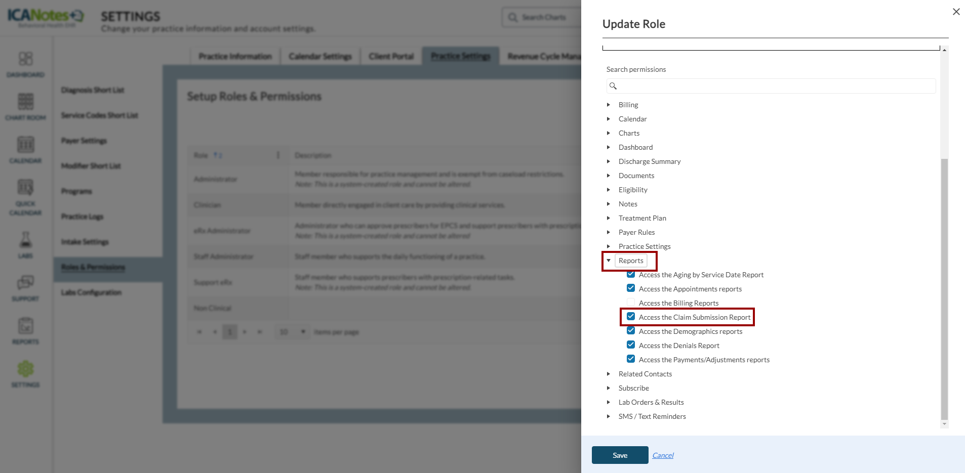 To assign the permission, navigate to Settings > Practice Settings > Roles & Permissions.