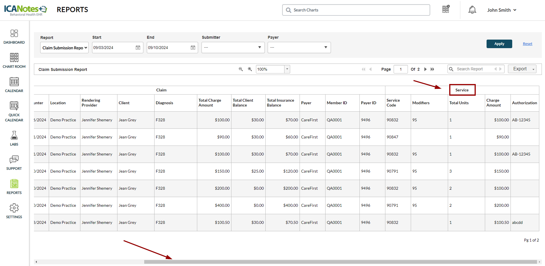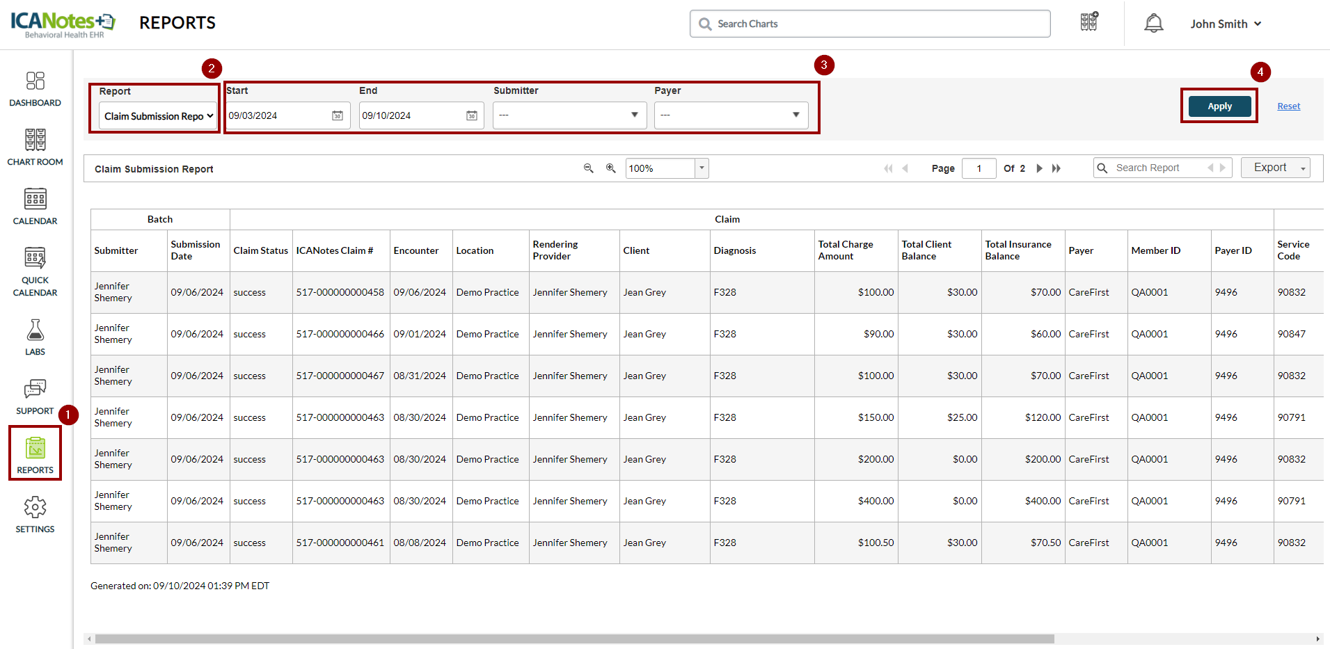 To access the new report, select the Reports option from the left sidebar, then select the Claim Submission Report option from the Report dropdown menu as shown below: