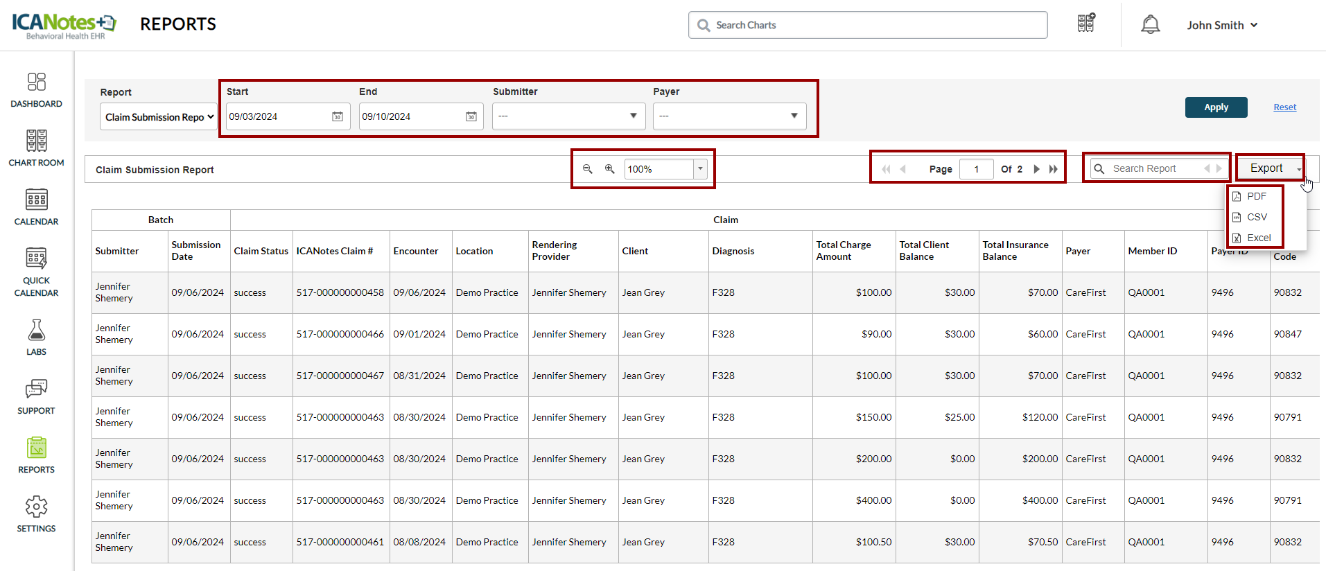 The Claim Submission Report features an enhanced user interface that includes the following key functionalities: