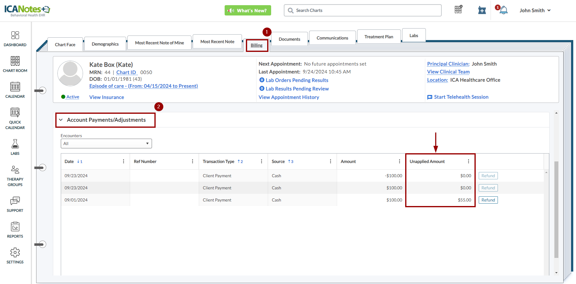Navigate to the Billing tab and scroll down to access the Account Payments/Adjustments panel. The Unapplied Amount column appears as shown below: