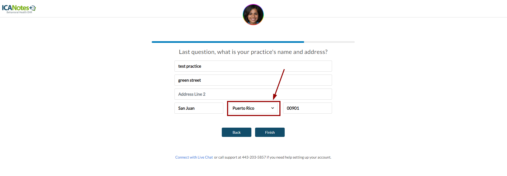Clients signing up for ICANotes+ will now see 'Puerto Rico' as an available option in the State dropdown. This option is also available for existing clients when updating their practice information. The 'Puerto Rico' option can be selected on the following screens where users can choose their state.