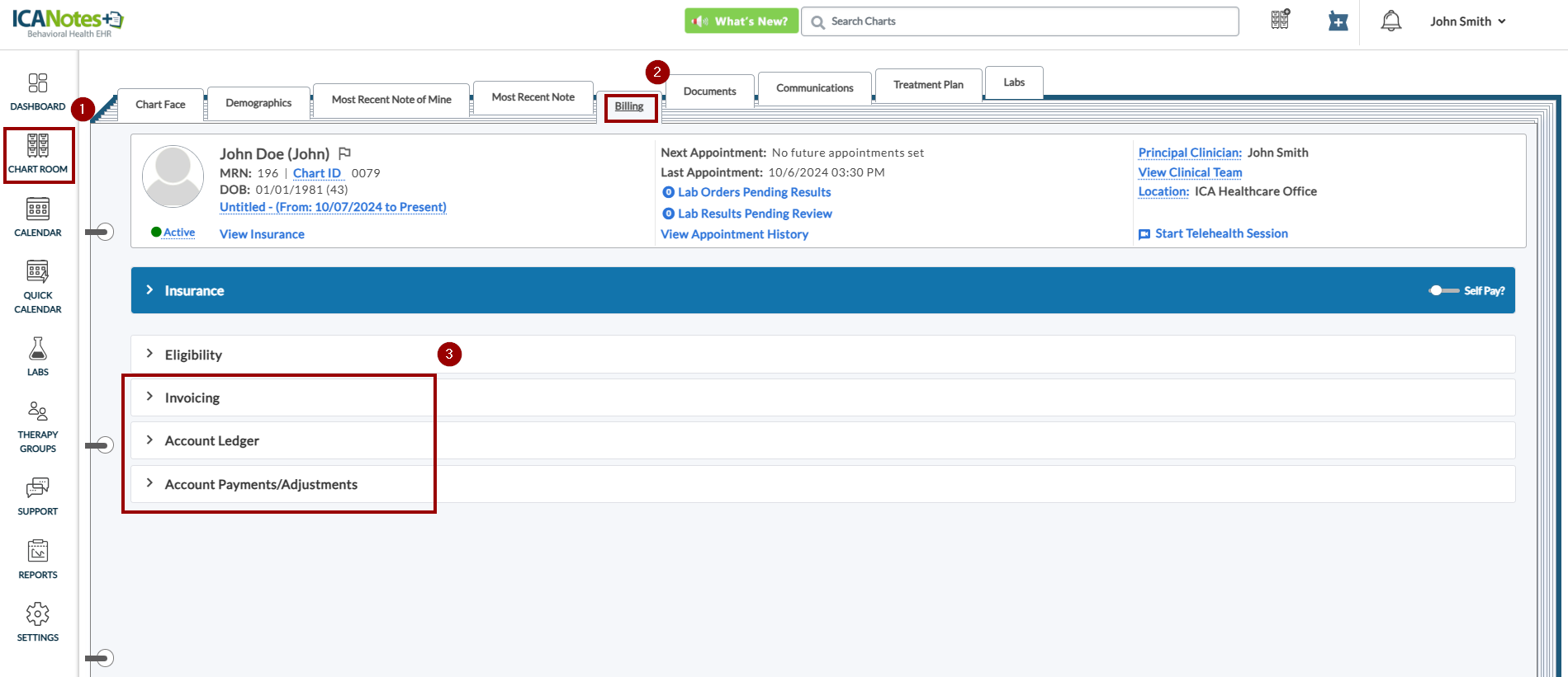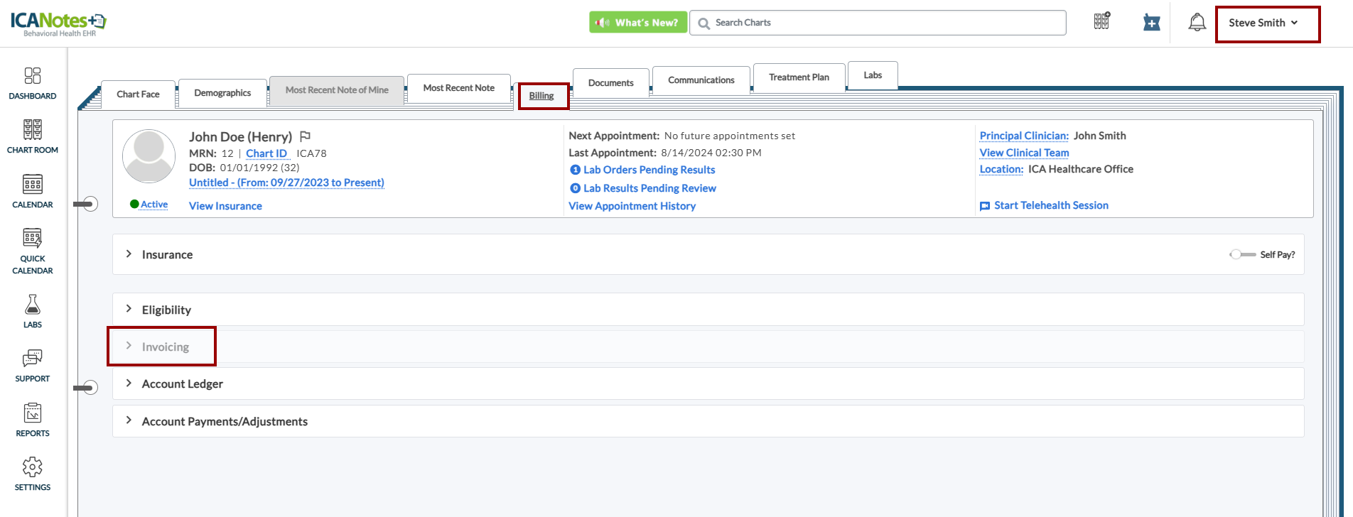 In this example, the clinician does not have access to the Invoicing section.
