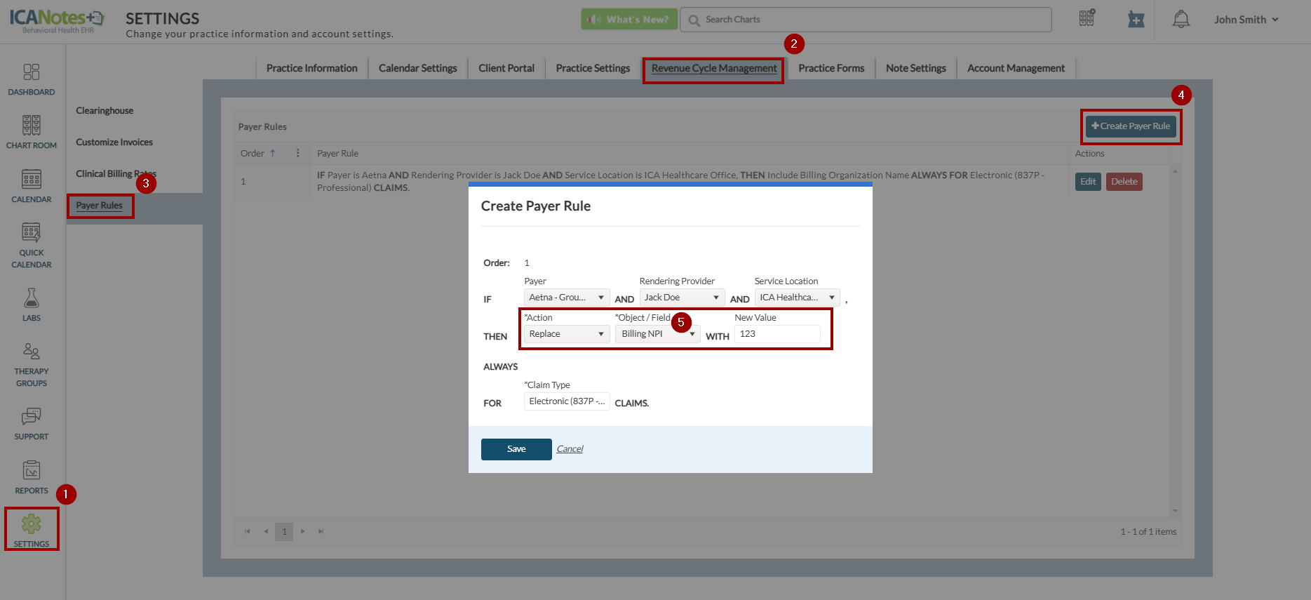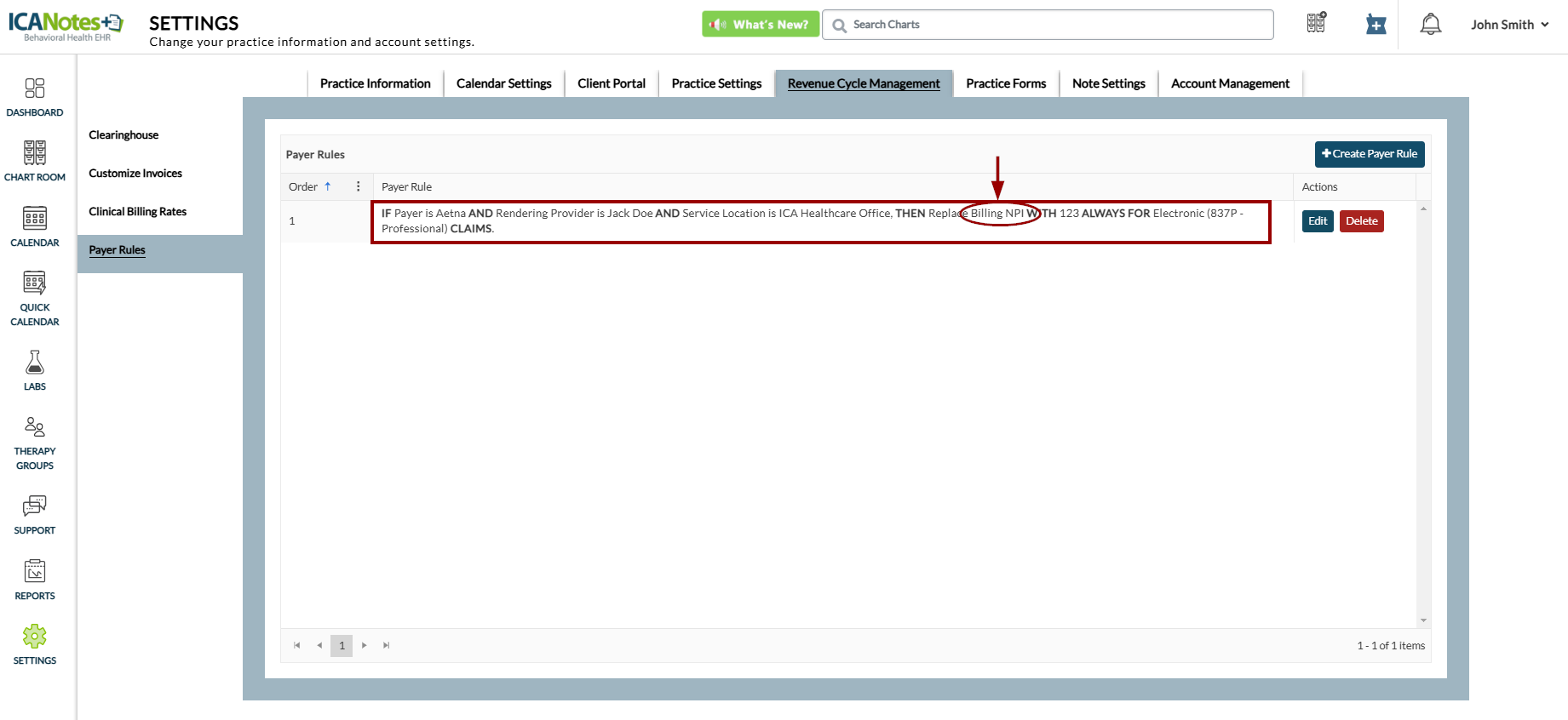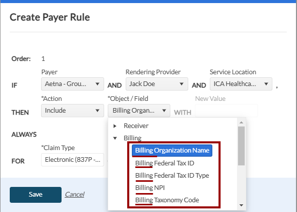 Previously, when creating a payer rule, the sentence format did not clearly specify which details were being referenced. For example, a rule created to replace the "Billing NPI" would only display "NPI" in the rule, making it unclear if it referred to the Billing NPI, Rendering Provider NPI, or Referring Provider NPI. Now, the exact detail will appear within the rule, as shown below.