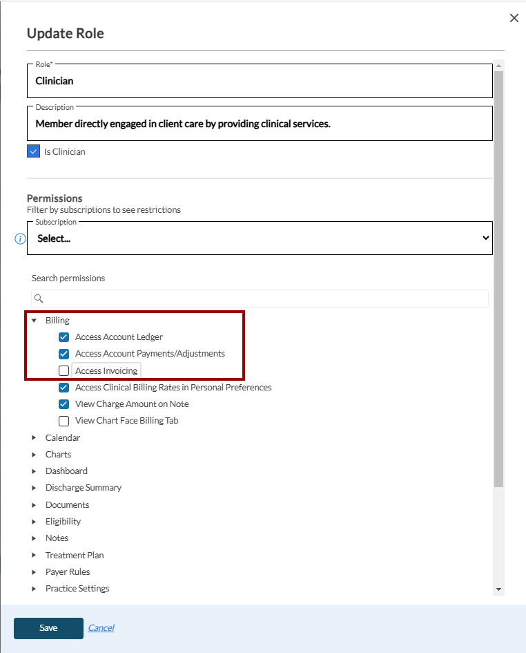 In the client’s chart, the following panels within the Billing section are now permission-based. Only authorized users will have access to these details when expanding each panel: