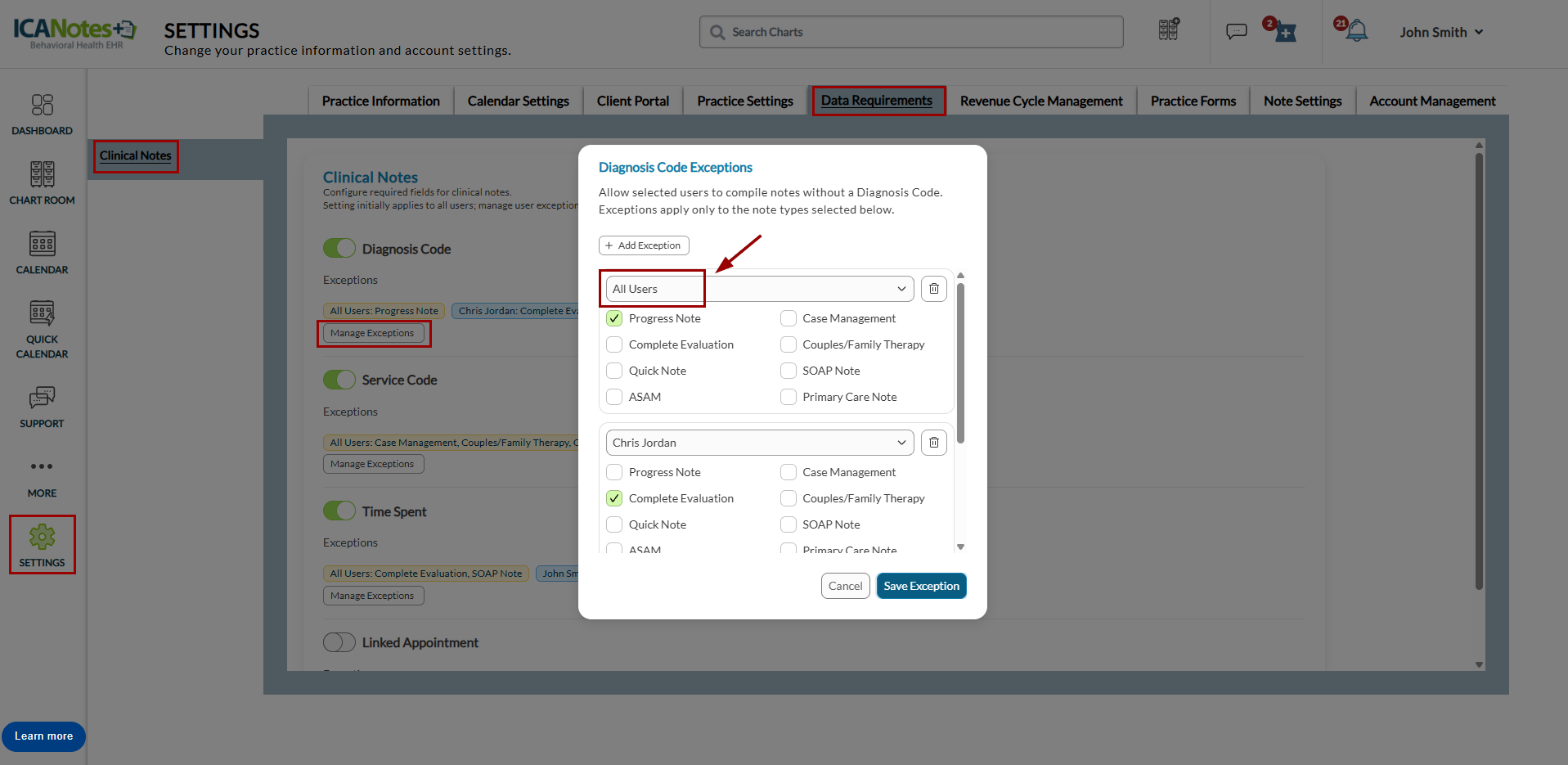 When you select All Users for an exception on a specific required field and note type, every practice user can compile that note type without completing the required field.