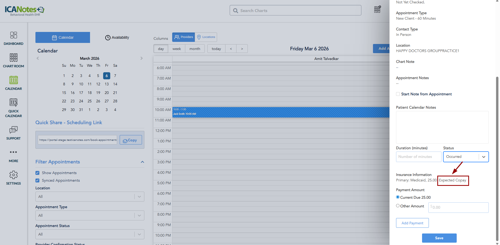 The Copay Due label in the calendar appointment view is updated to Expected Copay.