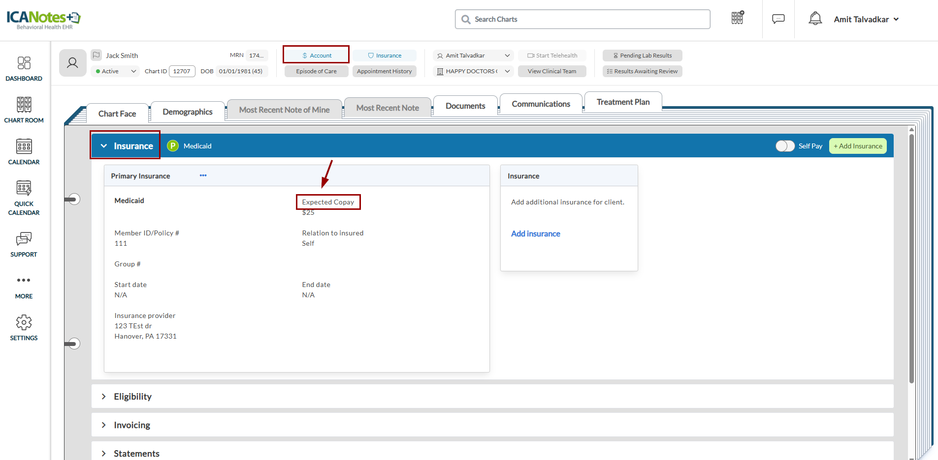 The Copay label in the Insurance section is updated to Expected Copay to clarify that the amount is an estimate until the claim is adjudicated.