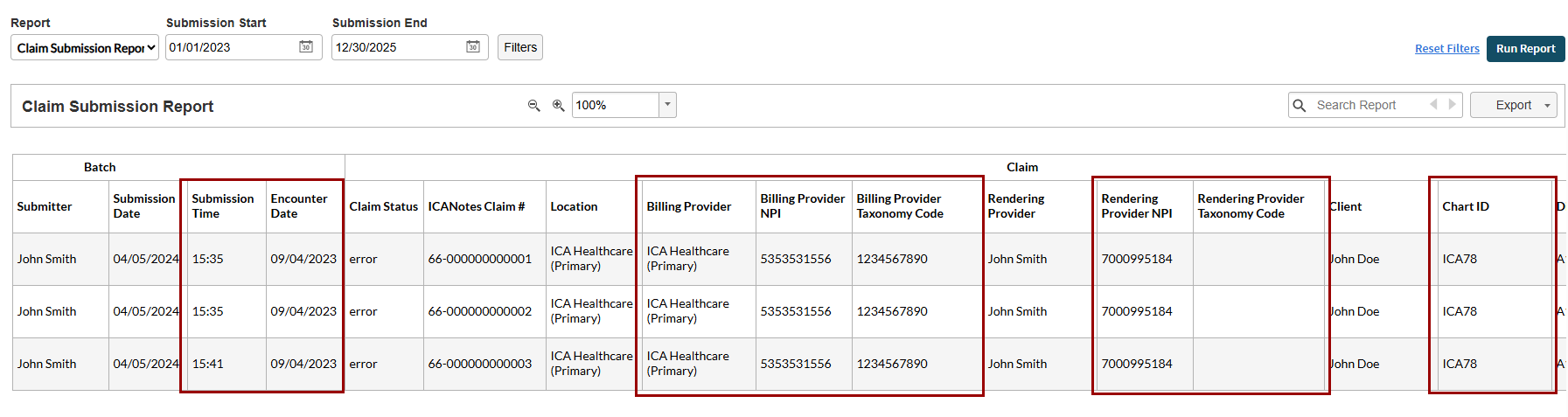 The Claim Submission Report has been enhanced with new filters and additional columns.