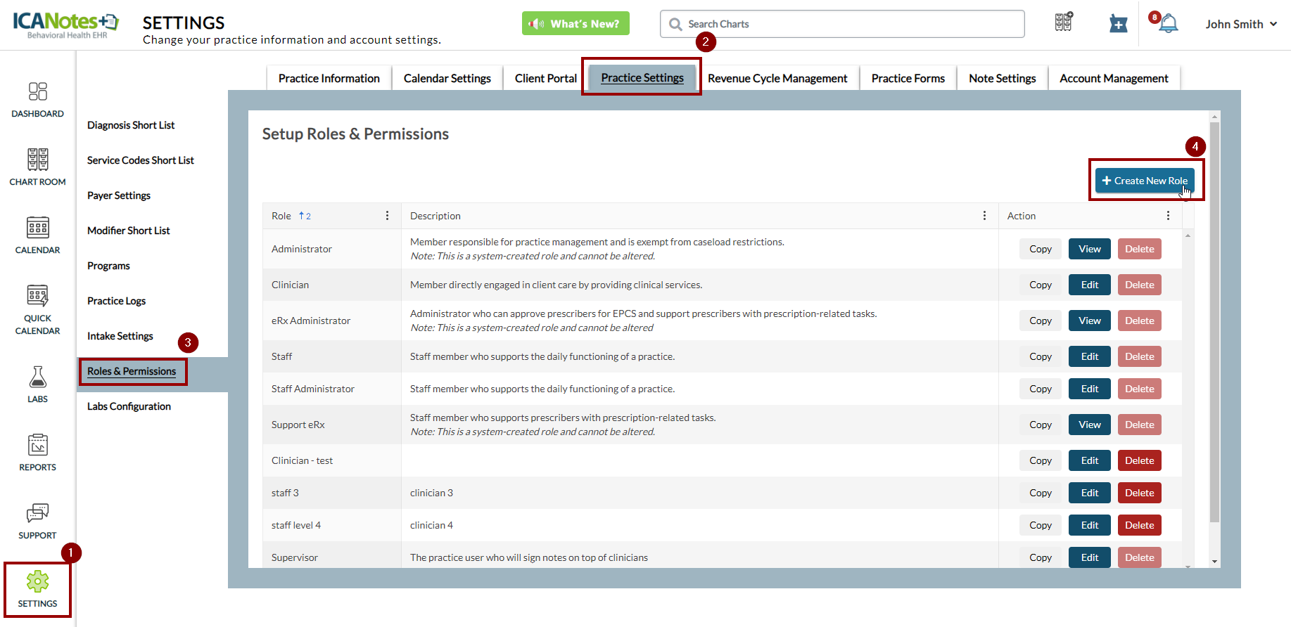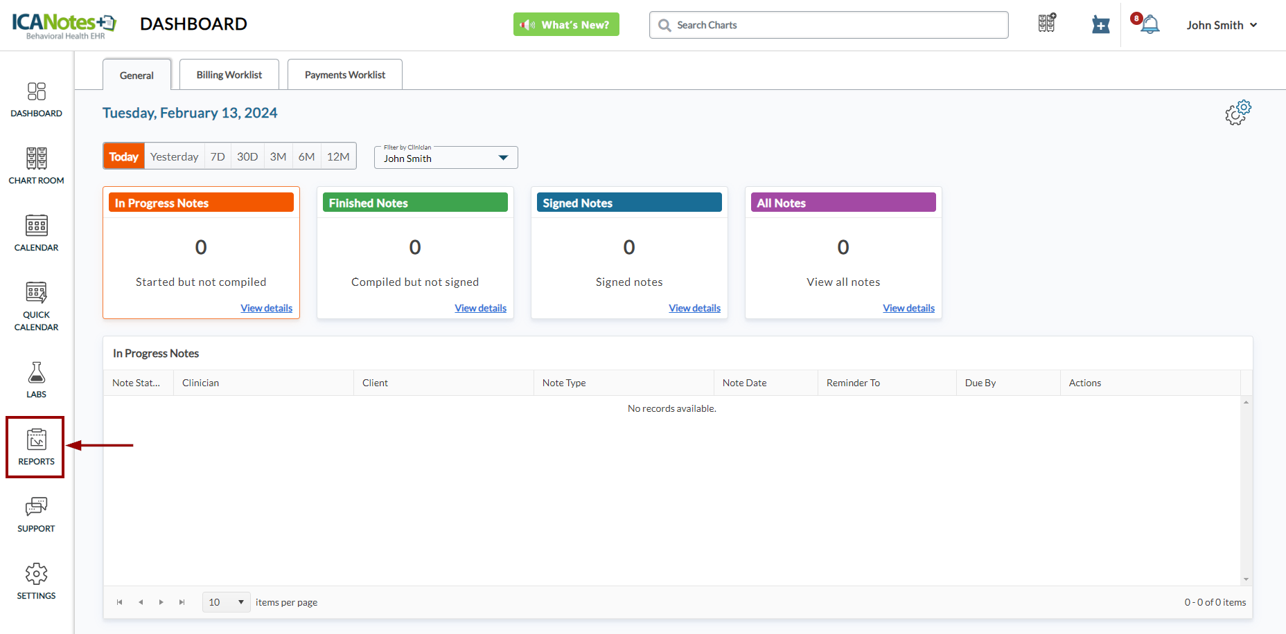 Once logged on to ICANotes+, click the Reports option from the left sidebar as shown in the screen below.