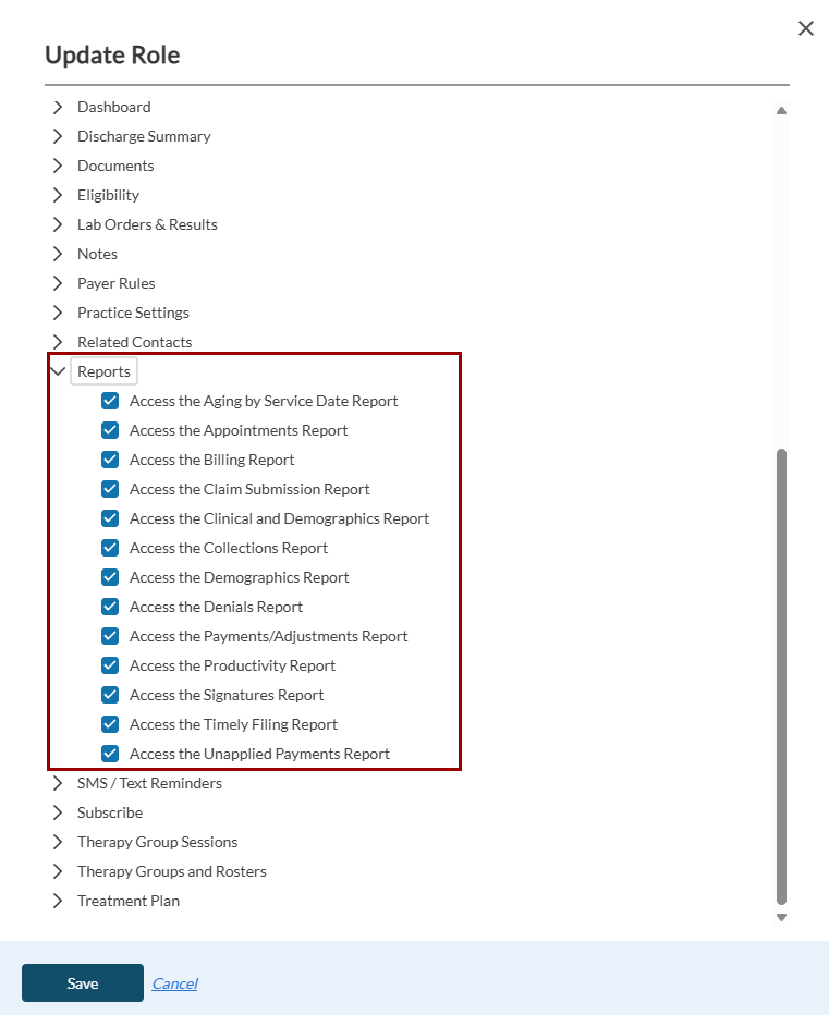 When you expand the Reports permission, you can see the report options as shown in the screen below: